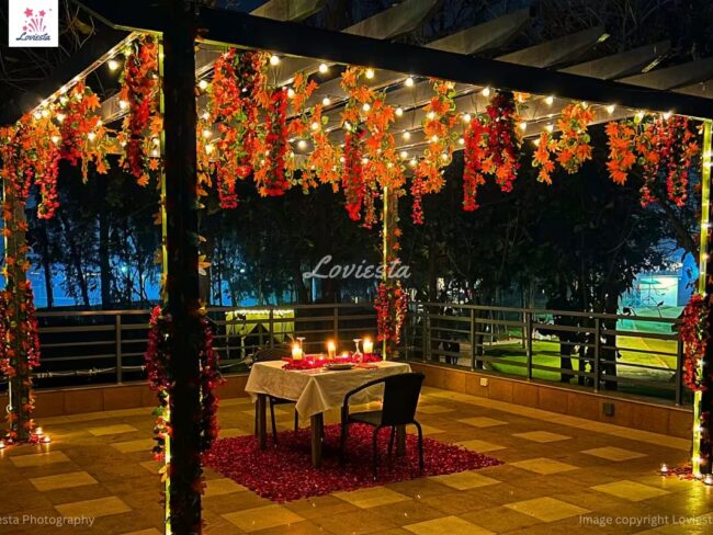 - Romantic dinner setup – Decorated with flowers, Roses, Marigolds, Cushions, and Candles.