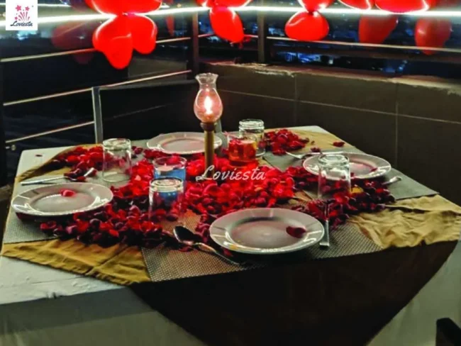 The package typically includes a multi-course food menu with veg/non-veg preferences, Romantic decoration with candles & rose petals & often other customizations varying from package to package.