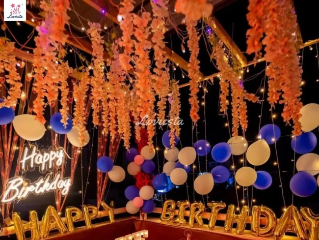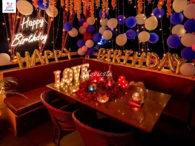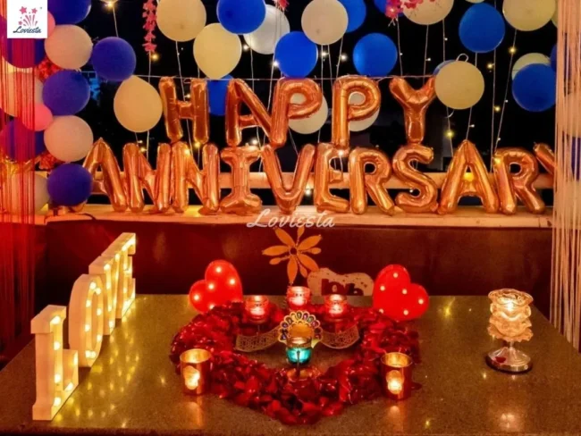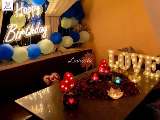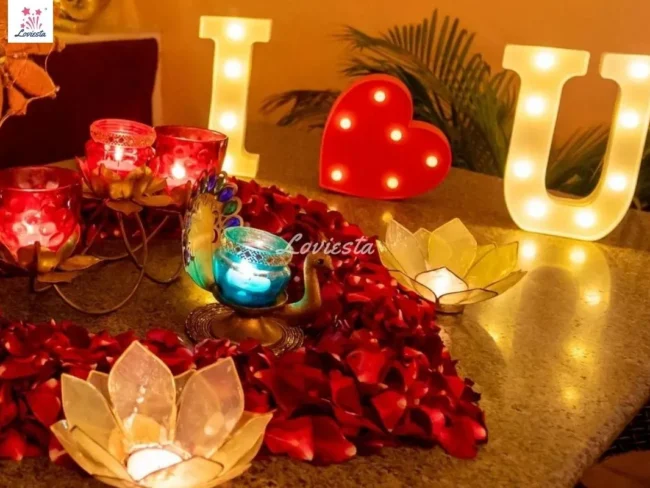 The package typically includes a multi-course food menu with veg/non-veg preferences, Romantic decoration with candles & rose petals & often other customizations varying from package to package.