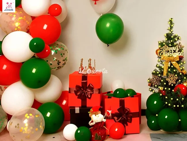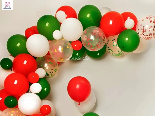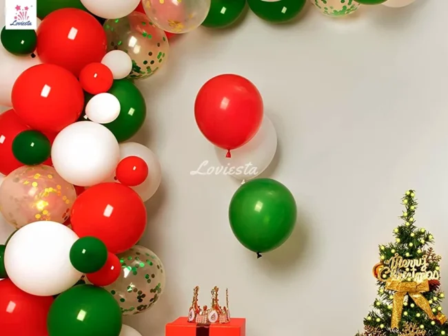 - 150 Air-filled balloons (Metallic Red & Green, and pastel White) arch setup with the wall.