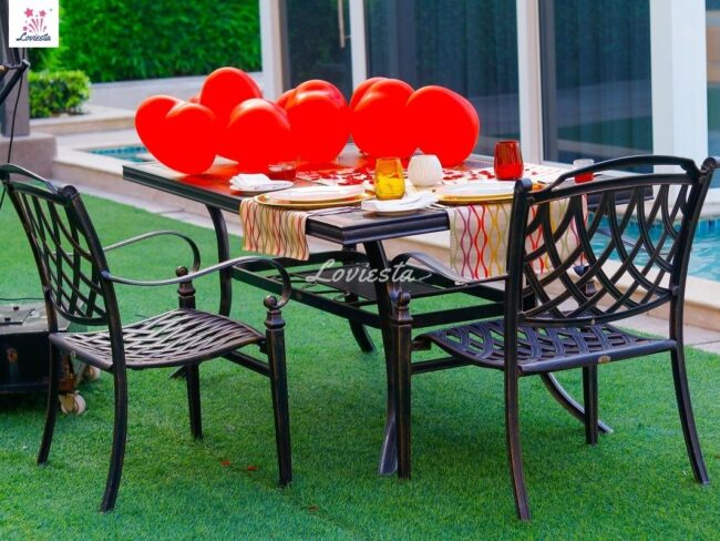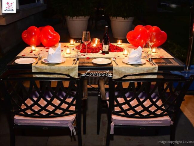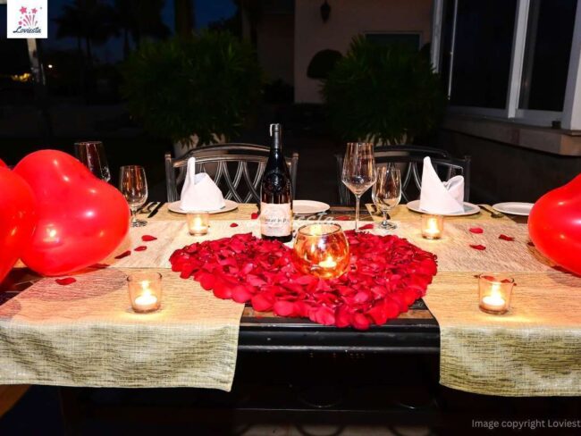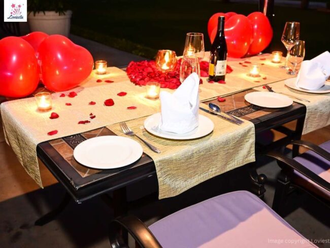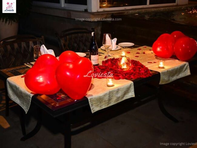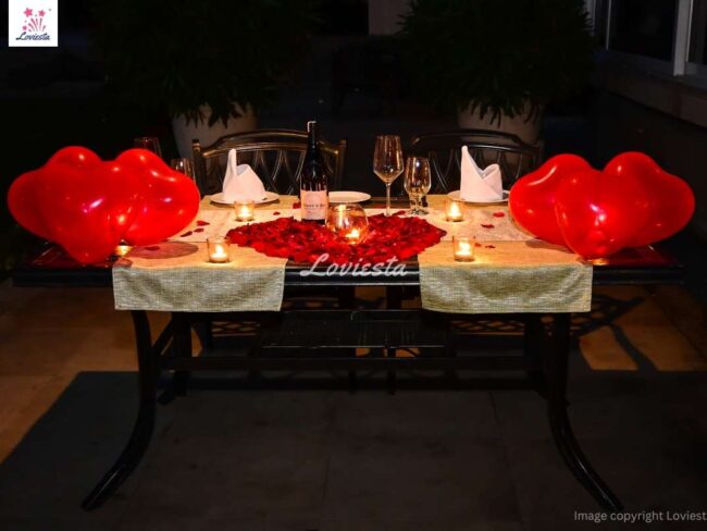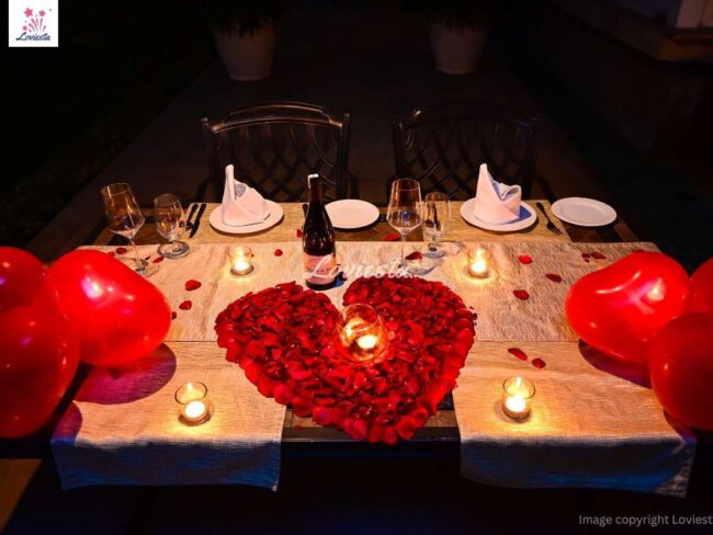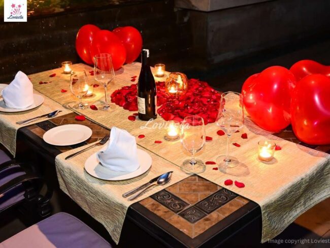 - Rose petals, candles & balloon decorations on the table.