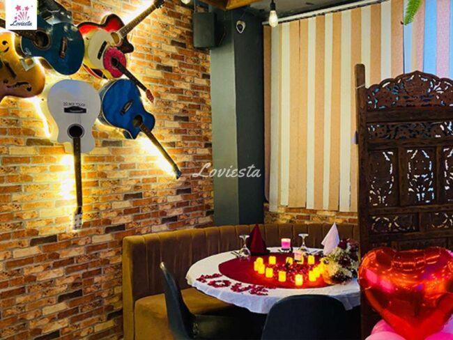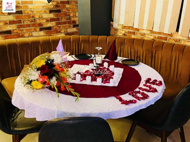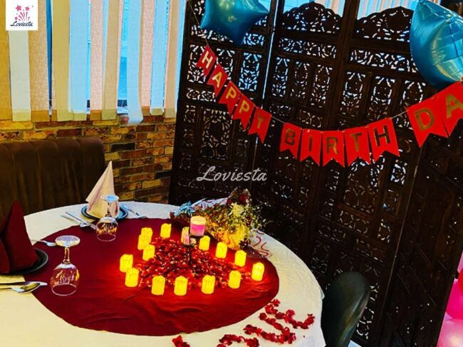 The package typically includes a multi-course food menu with veg/non-veg preferences, Romantic decoration with candles & rose petals & often other customizations varying from package to package.