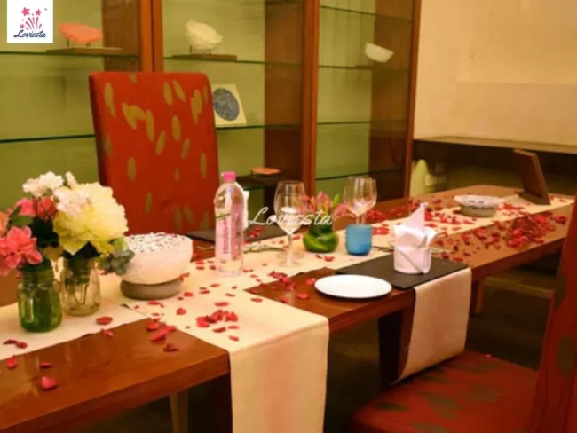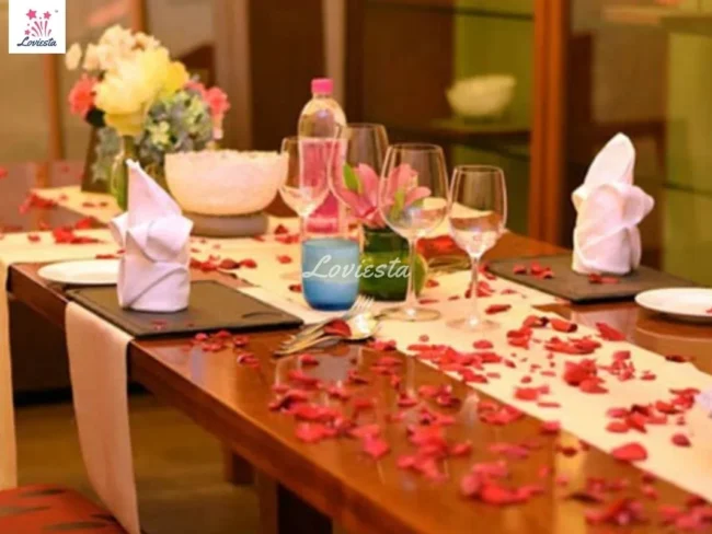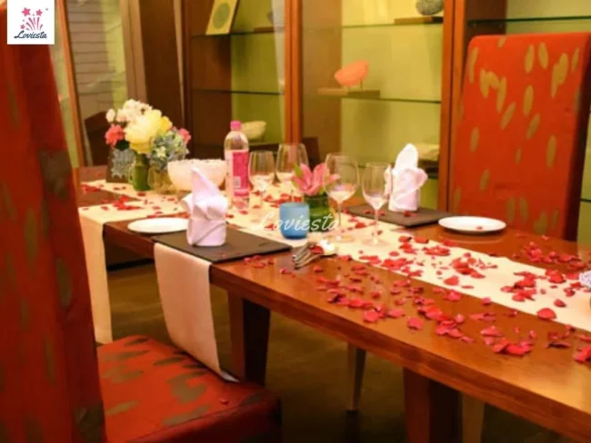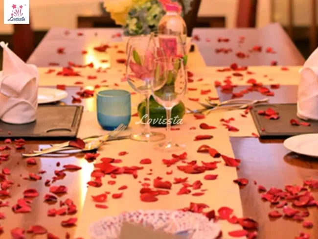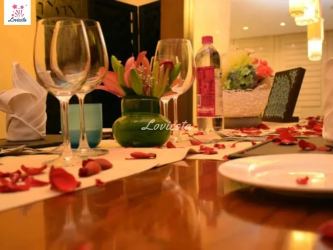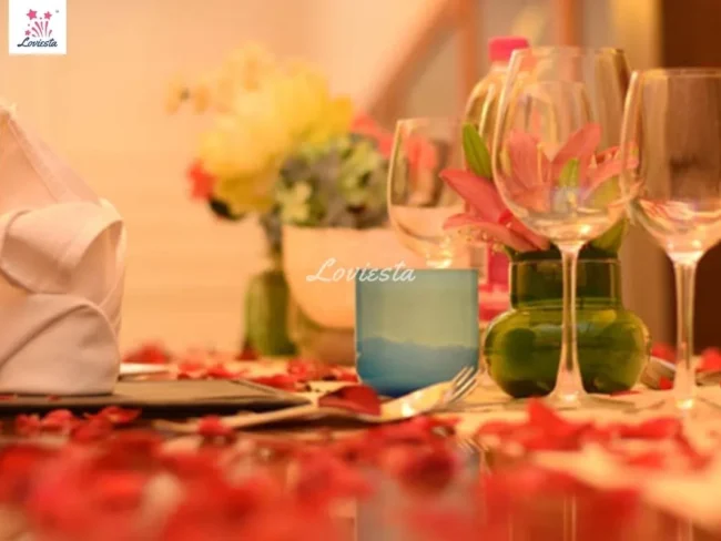 The package typically includes a multi-course food menu with veg/non-veg preferences, Romantic decoration with candles & rose petals & often other customizations varying from package to package.