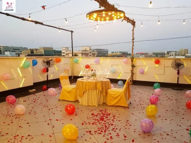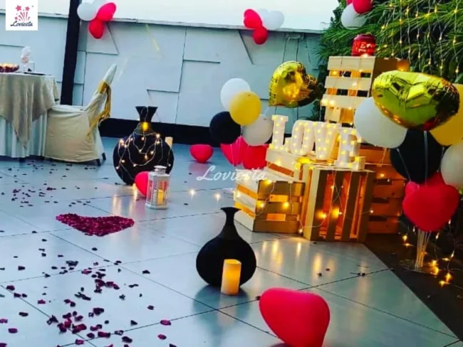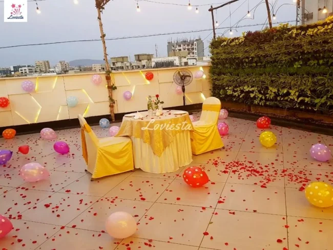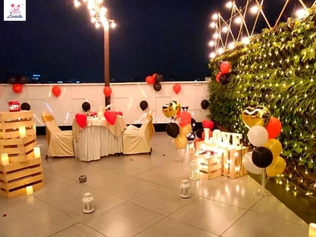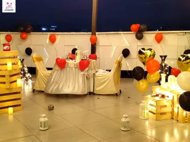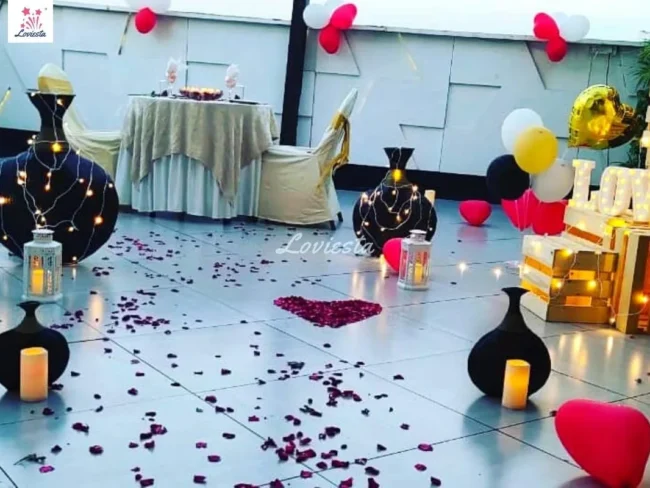 The package typically includes a multi-course food menu with veg/non-veg preferences, Romantic decoration with candles & rose petals & often other customizations varying from package to package.