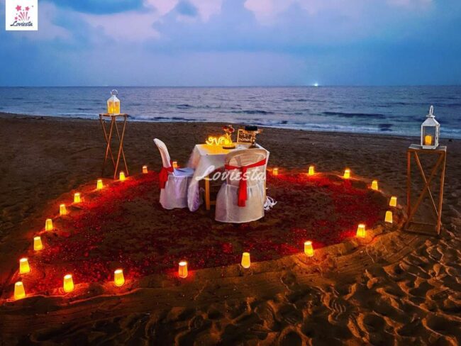 The package typically includes a multi-course food menu with veg/non-veg preferences, Romantic decoration with candles & rose petals & often other customizations varying from package to package.