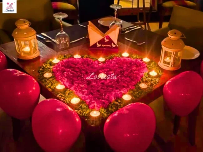 The package typically includes a multi-course food menu with veg/non-veg preferences, Romantic decoration with candles & rose petals & often other customizations varying from package to package.