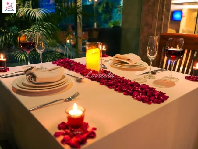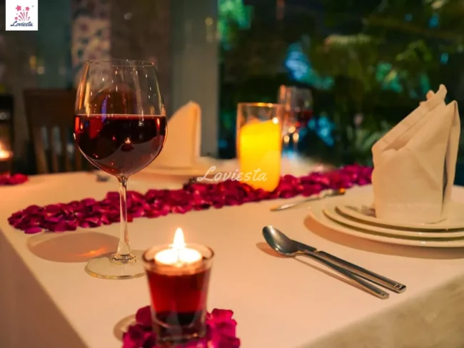 The package typically includes a multi-course food menu with veg/non-veg preferences, Romantic decoration with candles & rose petals & often other customizations varying from package to package.