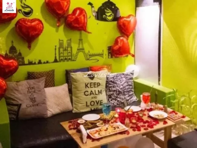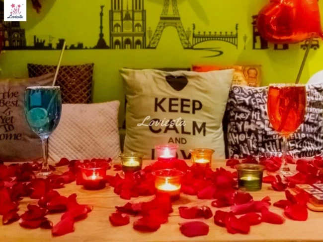 The package typically includes a multi-course food menu with veg/non-veg preferences, Romantic decoration with candles & rose petals & often other customizations varying from package to package.