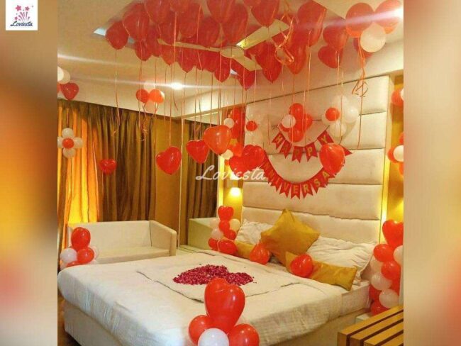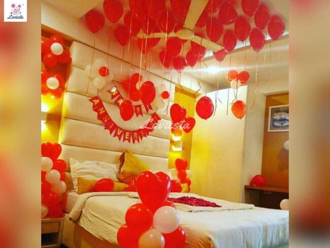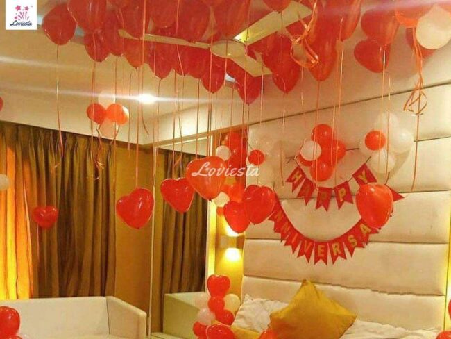 - Around 40 to 50 balloons with ribbons are stuck to the ceiling only and the rest are placed in the form of bunches or loose on the floor as per your choice.
