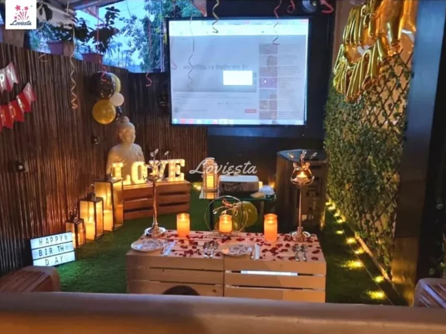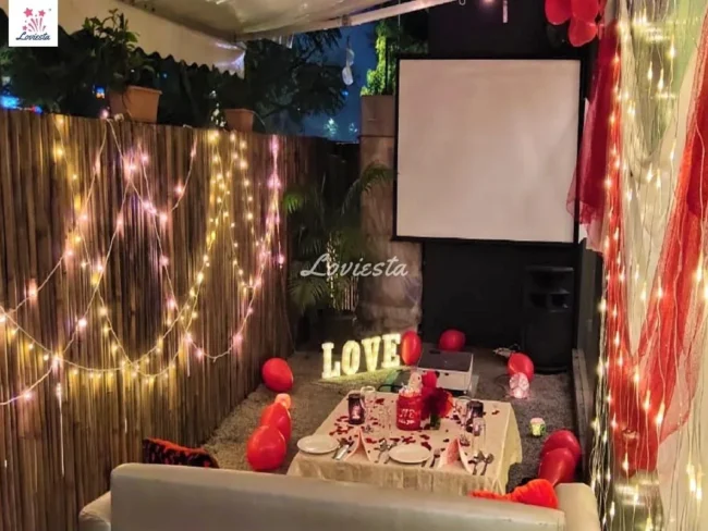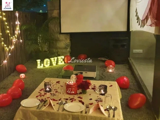 The package typically includes a multi-course food menu with veg/non-veg preferences, Romantic decoration with candles & rose petals & often other customizations varying from package to package.