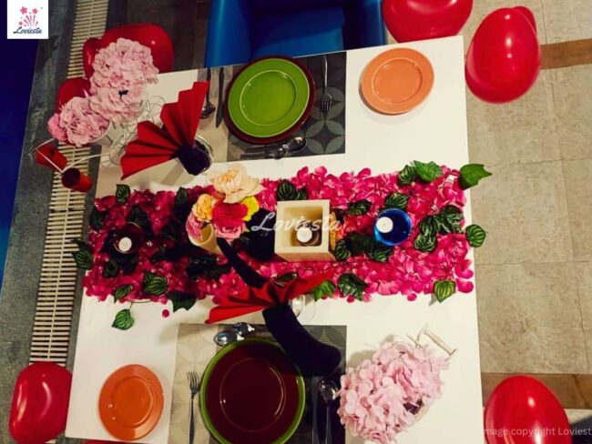 The package typically includes a multi-course food menu with veg/non-veg preferences, Romantic decoration with candles & rose petals & often other customizations varying from package to package.