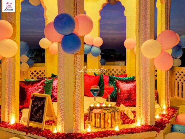 - Romantic dinner setup – Decorated with flowers, Roses, Marigolds, Cushions, and Candles.