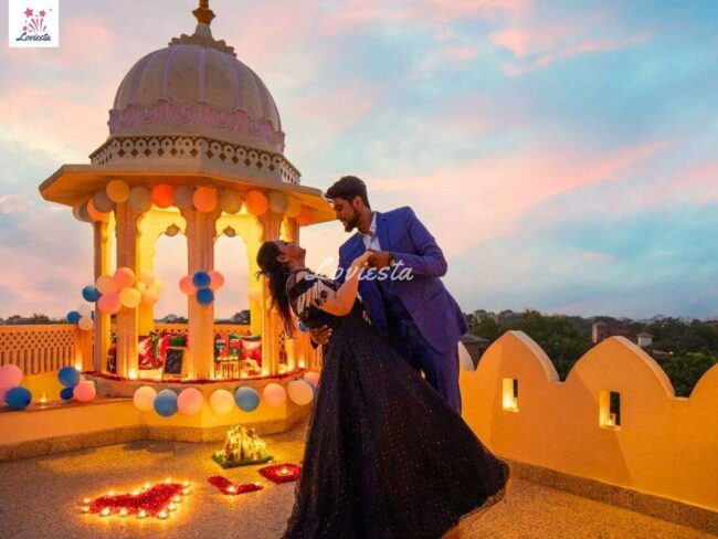 The package typically includes a multi-course food menu with veg/non-veg preferences, Romantic decoration with candles & rose petals & often other customizations varying from package to package.